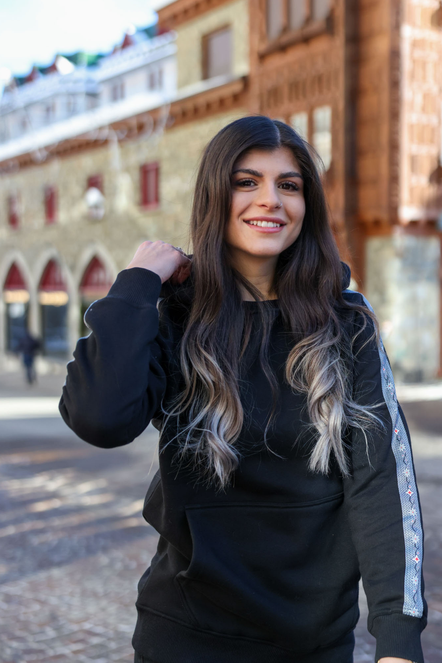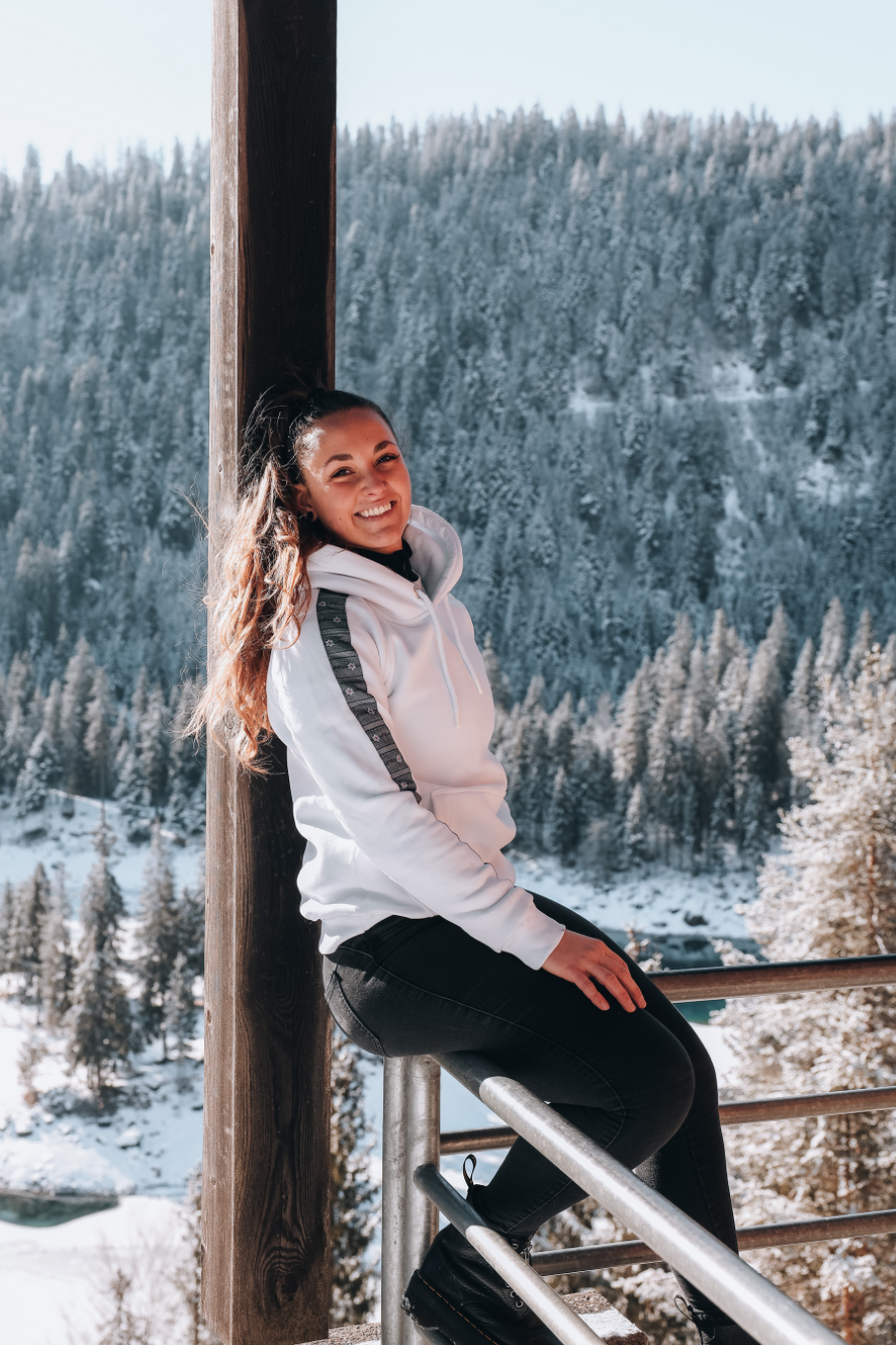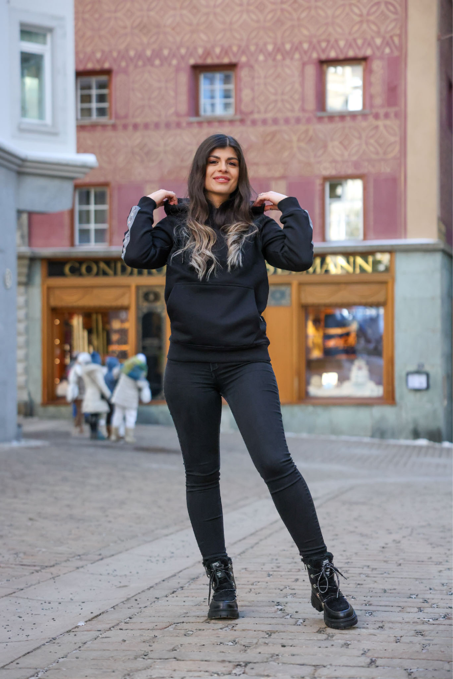 100% premium Baumwolle nachhaltig produziert und Du spürst den besonderen Flauschfaktor auf der kuscheligen Innenseite. Blicke fangen dann die Edelweiss-Streifen am Arm locker ein. Das aus ökologischen Farben gedruckte Edelweiss Design auf dem Polyester Streifen sorgt dafür, dass du das Swiss Design auch nach x-beliebigen Waschgängen mit voller Sättigung präsentieren kannst. Die offenen Taschen auf beiden Seiten und die schützende Kapuze mit Bändel bringen zusätzliche Funktionalität.