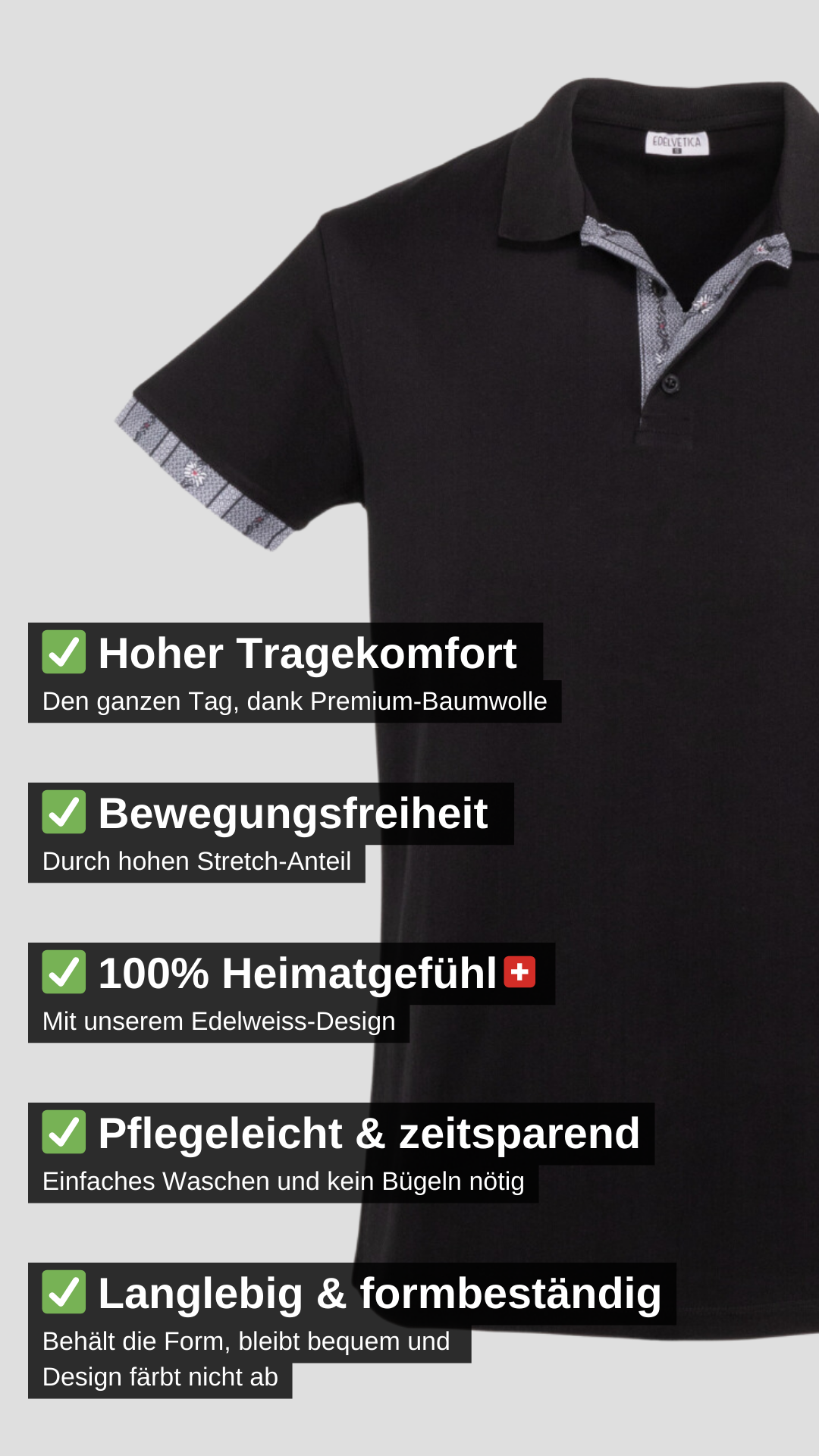 Erlebe Stil und Komfort auf höchstem Niveau mit unserem Edelweiss Polo Shirt für Herren. Gefertigt aus 95% Premium-Baumwolle und 5% Elasthan, vereint dieses Shirt aussergewöhnliche Qualität mit einem einzigartigen Design, das unser exklusives Edelweiss-Muster an Kragen und Armabschlüssen präsentiert. Verfügbar in einer Vielzahl von Farbkombinationen, bietet es vielseitige Styling-Optionen für jeden Anlass – von der Arbeit bis zu eleganten Events. Dank der Verwendung nachhaltiger Materialien garantiert dieses Polo-Shirt langlebige Qualität, während unser modernes Handwerk und das exklusive gezeichnete Edelweiss-Design eine Brücke zwischen Tradition und zeitgenössischer Mode schlagen. Ideal für vielfältige Verwendungszwecke, passt es perfekt zu jeder Garderobe.