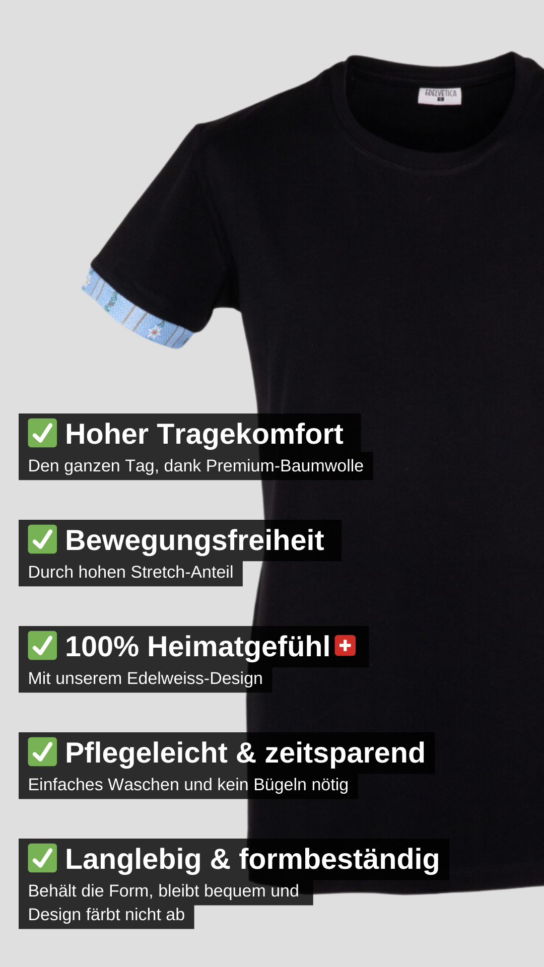 Jedes T-Shirt zeichnet sich durch ein spezielles Edelweiss-Design am Armabschluss aus, das unser Engagement für Authentizität und Liebe zum Detail widerspiegelt. Dieses eigens gezeichnete Design macht jedes Stück zu einem wahren Kunstwerk und verleiht deinem Outfit eine einzigartige Note.