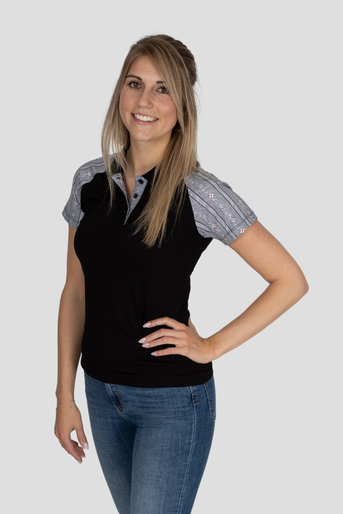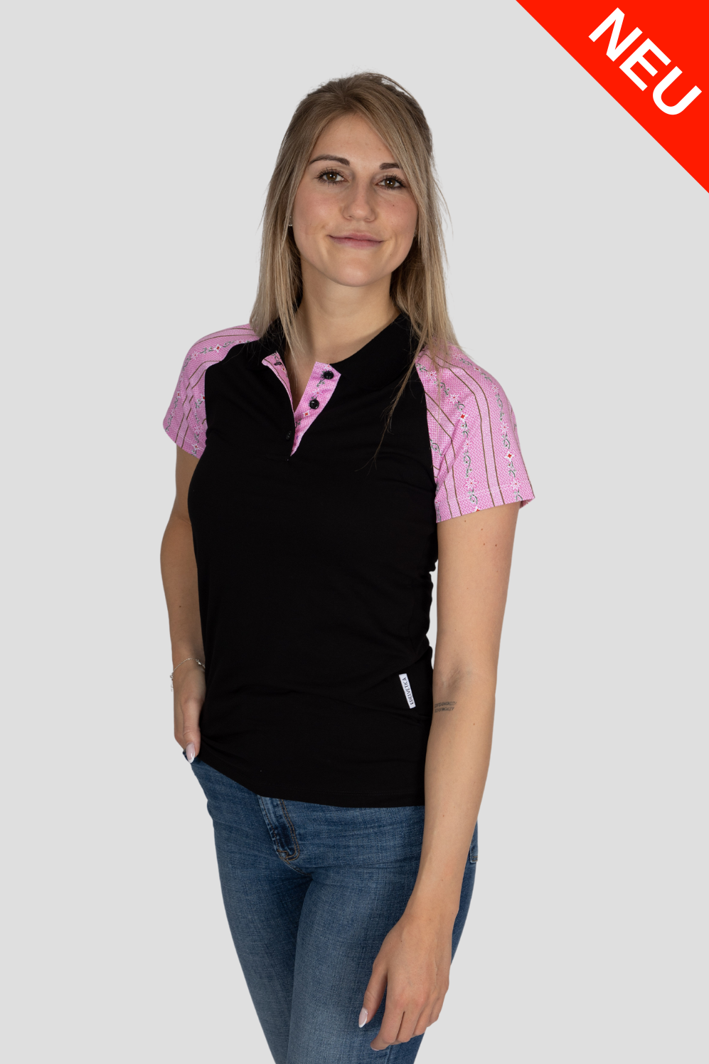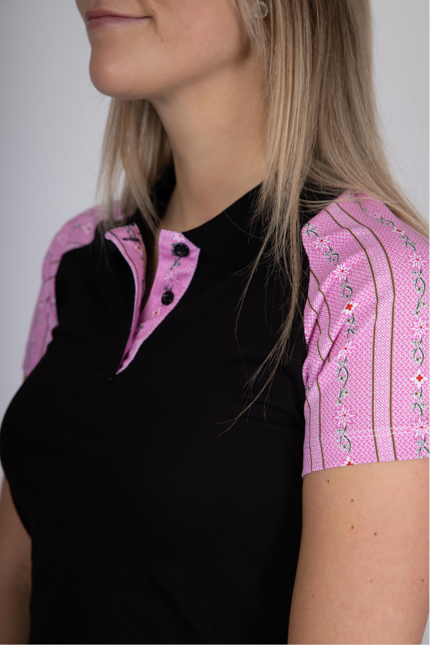 - Polo Shirt Schwarz mit pinkem Edelweiss