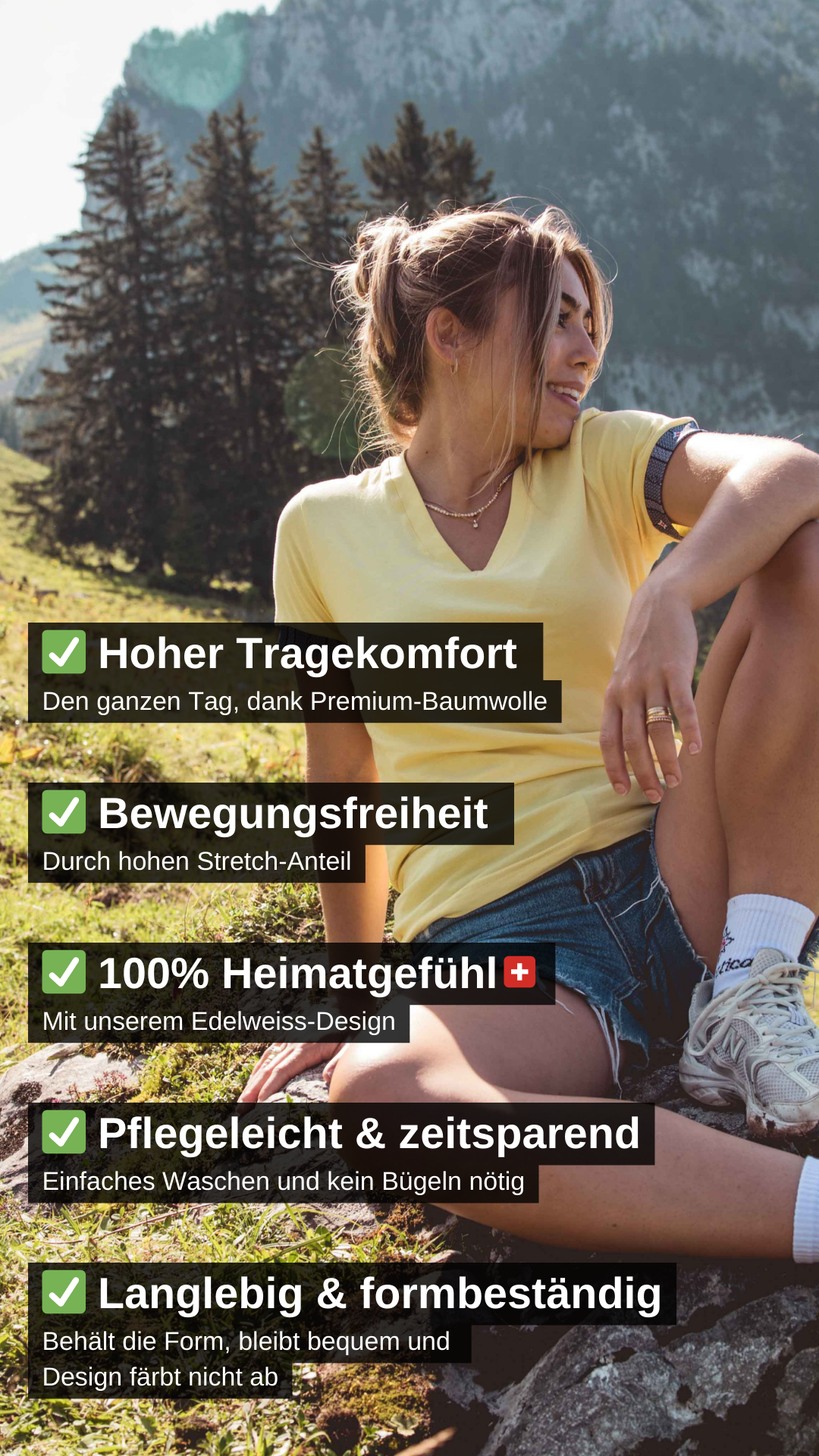 Unser "T-Shirt Edelweiss Original Damen" besteht aus 95% Premium-Baumwolle und 5% Elasthan, was dir einen unvergleichlichen Tragekomfort und eine optimale Passform bietet. Die sorgfältige Auswahl hochwertiger Materialien garantiert nicht nur eine angenehme Haptik, sondern auch die Langlebigkeit des Produkts.