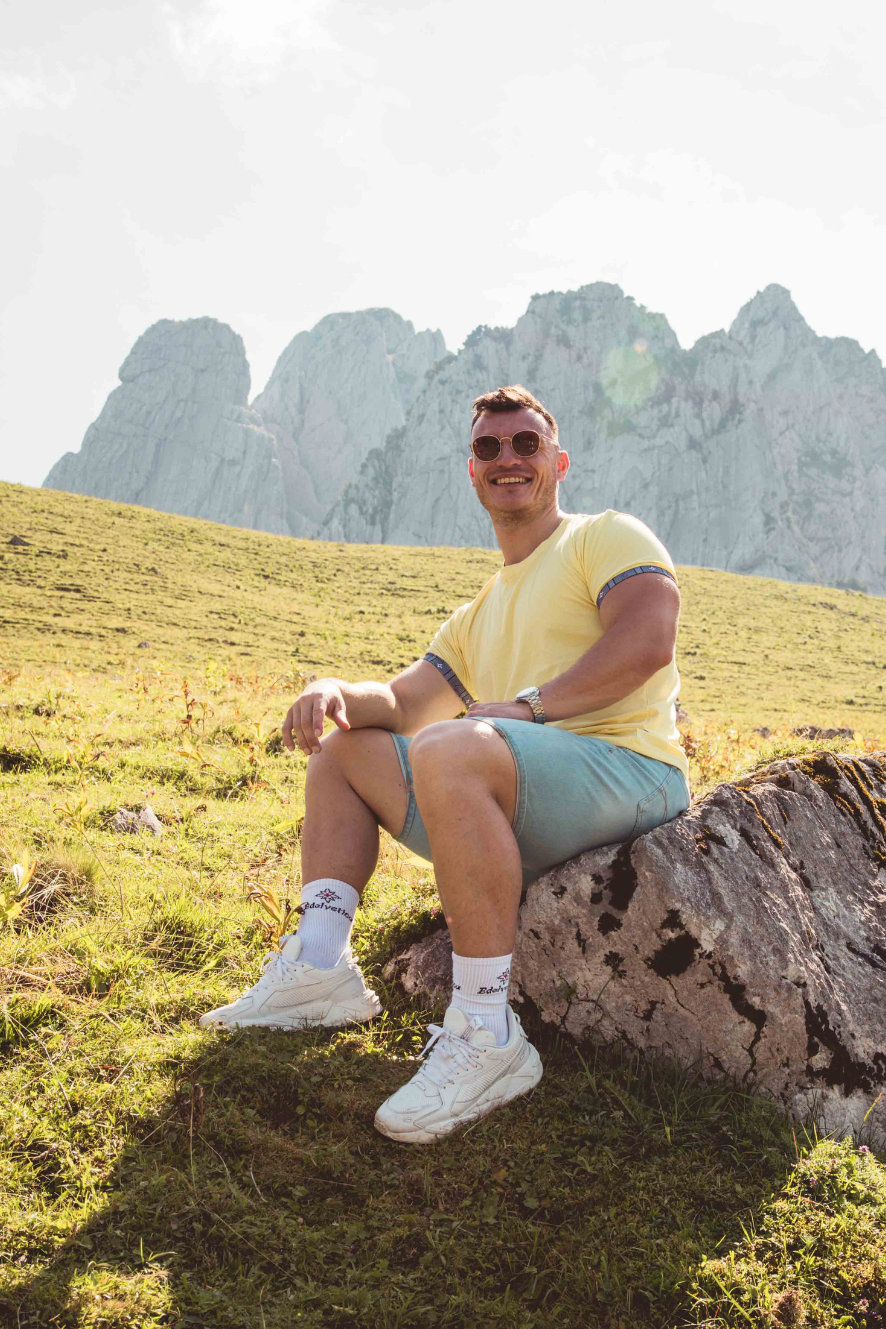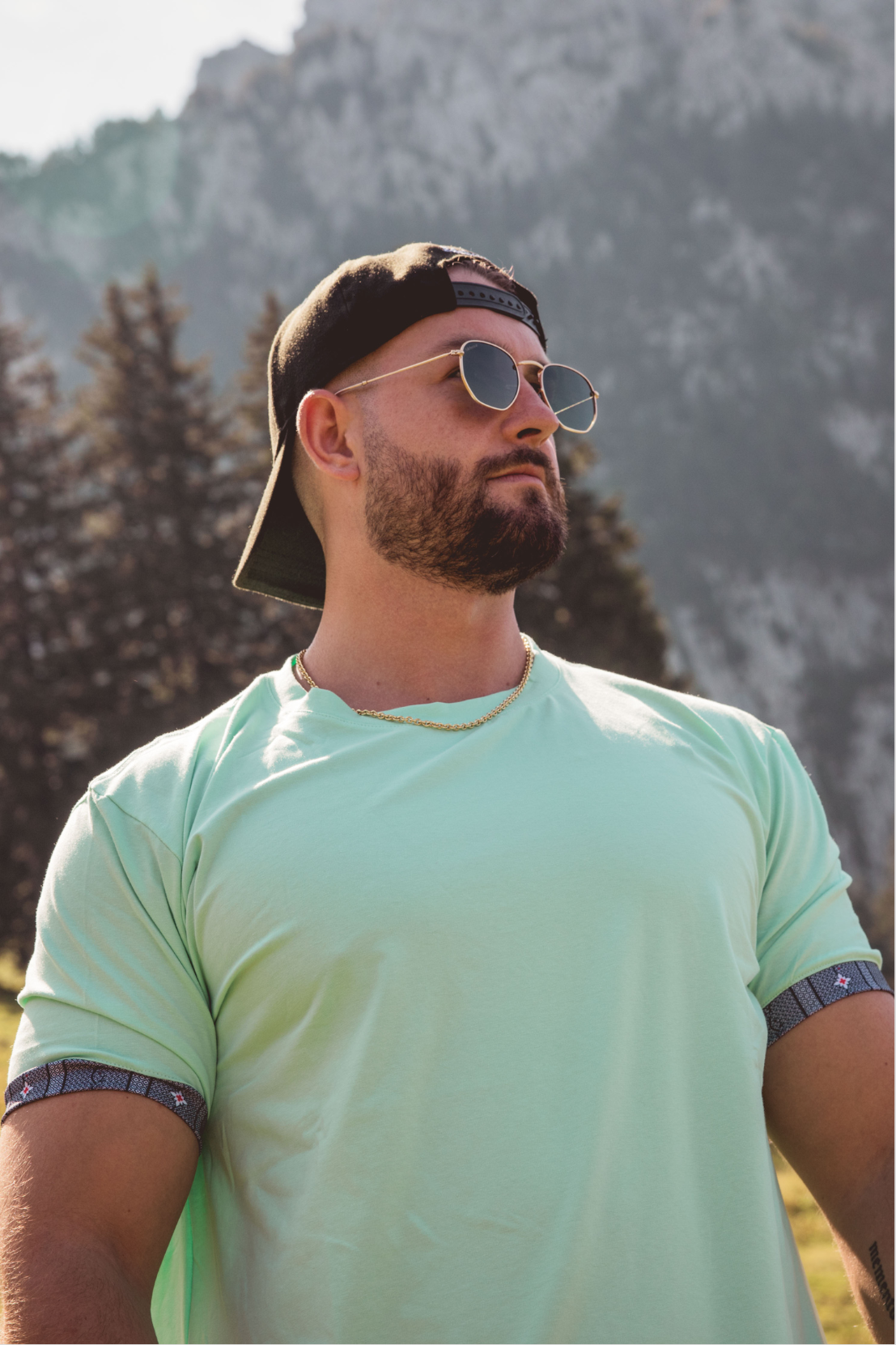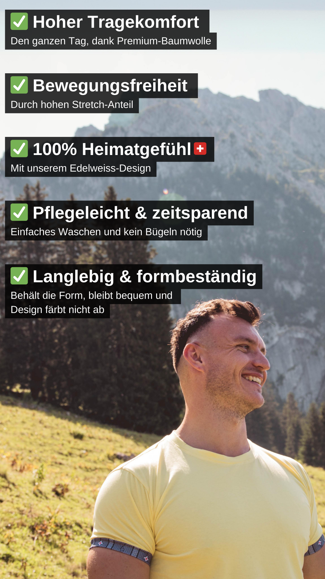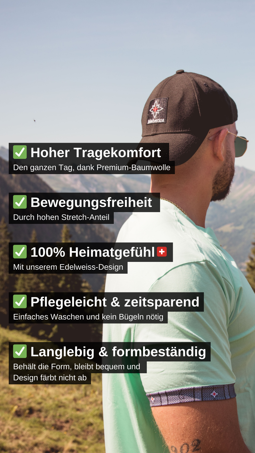 Jedes T-Shirt zeichnet sich durch ein spezielles Edelweiss-Design am Armabschluss aus, das unser Engagement für Authentizität und Liebe zum Detail widerspiegelt. Dieses eigens gezeichnete Design macht jedes Stück zu einem wahren Kunstwerk und verleiht deinem Outfit eine einzigartige Note.